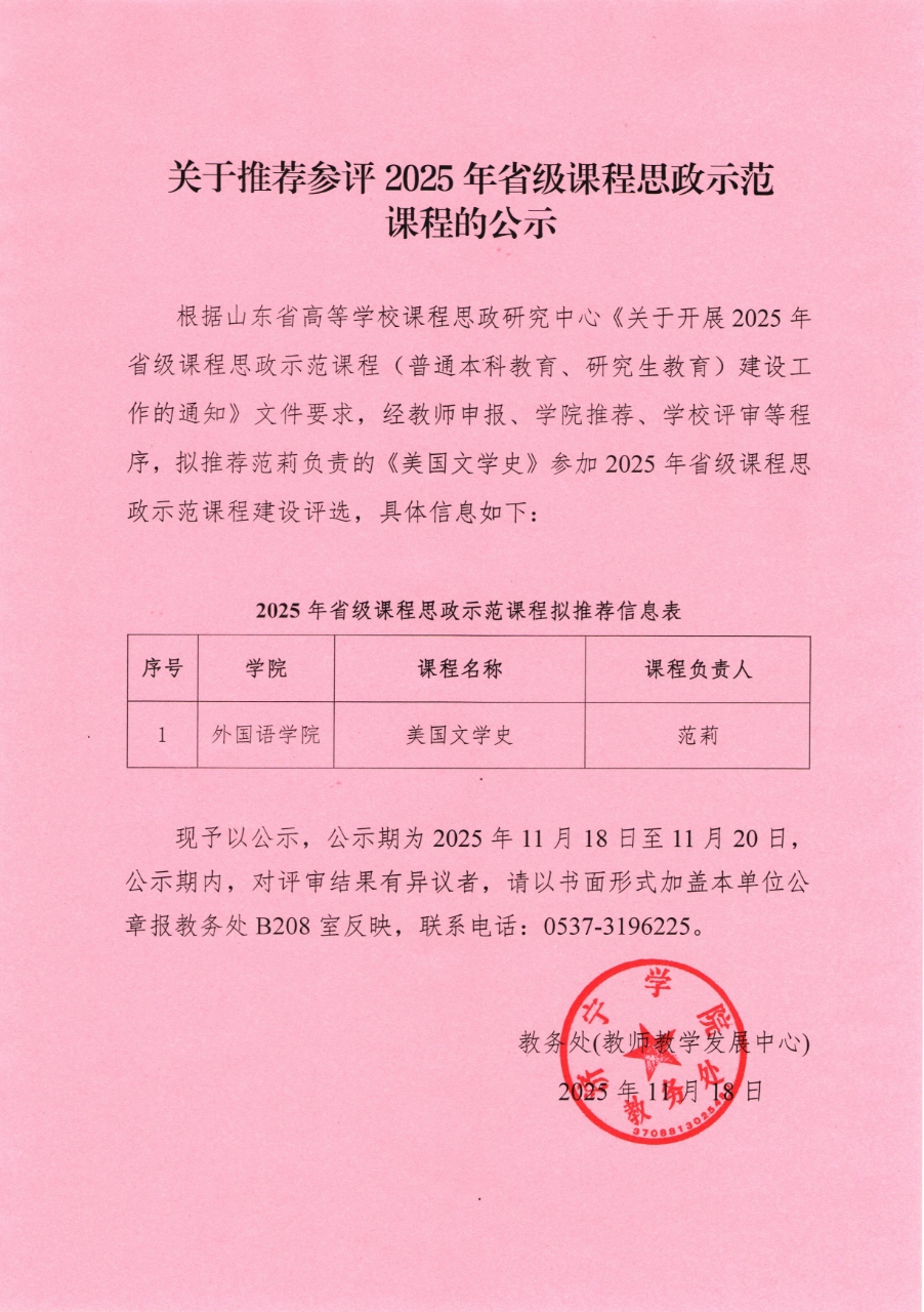 关于推荐参评2025年省级课程思政示范课程的公示