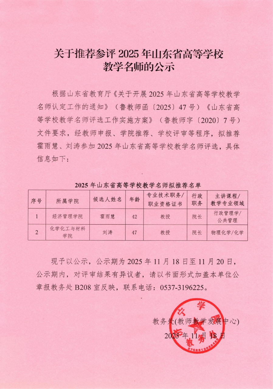 关于推荐参评2025年山东省高等学校教学名师的公示