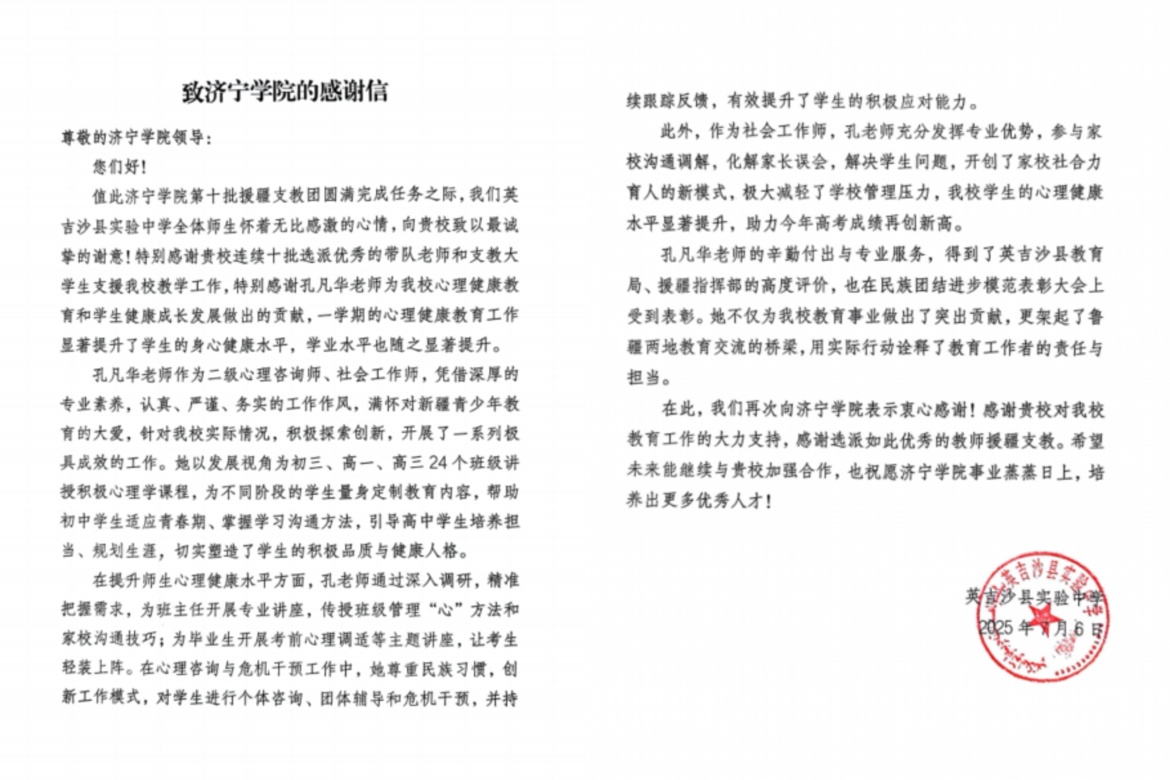 近日,我校收到新疆英吉沙县实验中学向我校发来感谢信,信中充分肯定了我校援疆师生在援疆工作中的优秀表现,对我校连续十批选派优秀的带队教师和大学生支援教学工作,特别是第十批援疆支教团带队教师孔凡华老师,在支教带队期间利用专业优势,为该校心理健康教育和学生健康成长发展作出的贡献表示感谢!